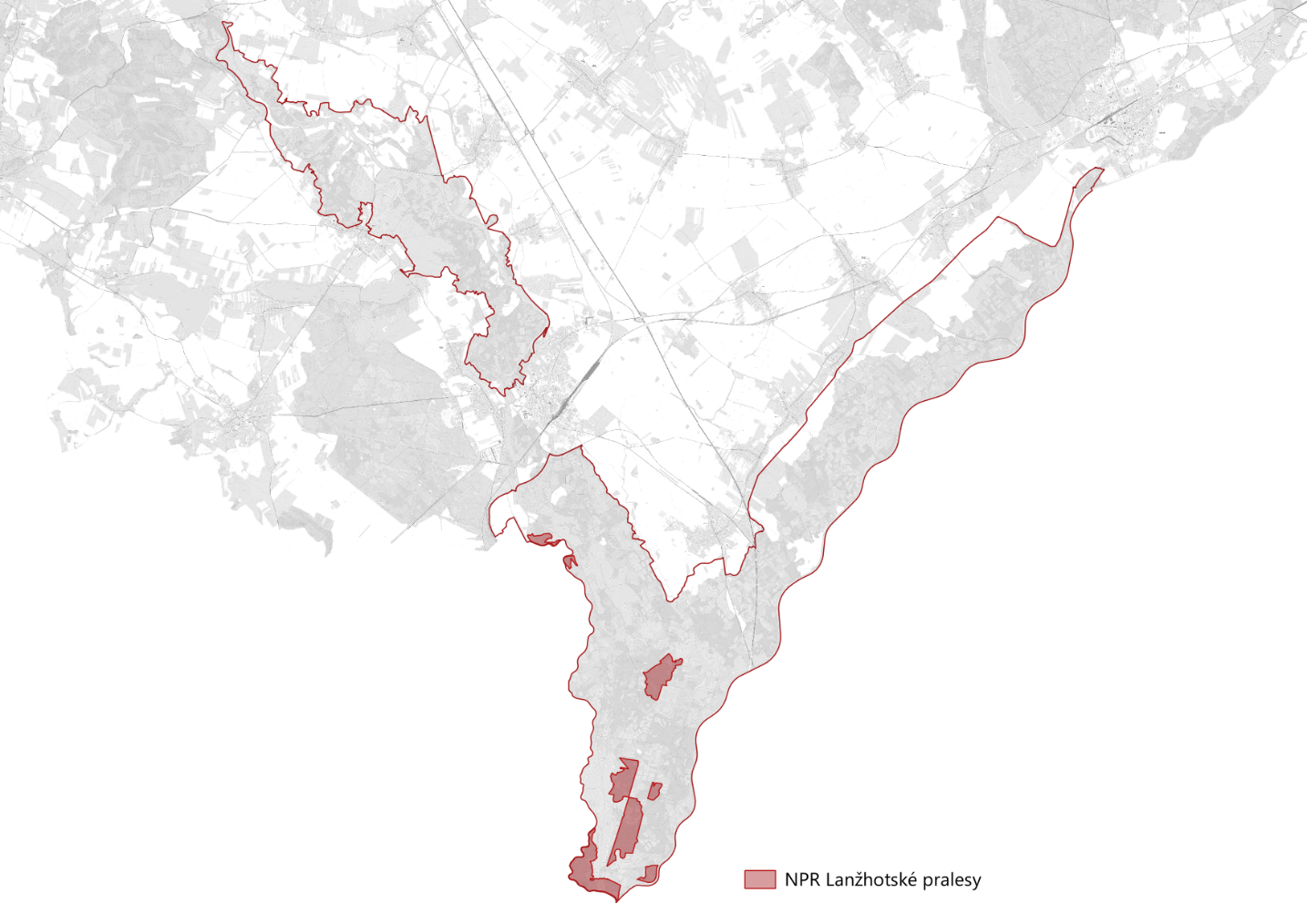 Mapa s vyznačením národní přírodní rezervace Lanžhotské pralesy.